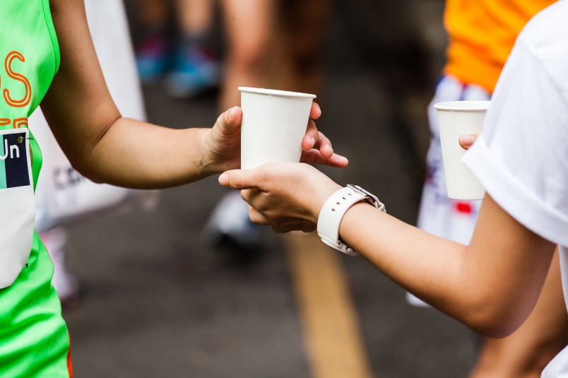 - 進站前可跟遞水的志工眼神示意、舉手比 1,代表「我要這杯水」,也順便提醒後面的跑者別搶,取水後請迅速返回賽道、不要突然停下來,以免耽誤下一位取水或發生碰撞。