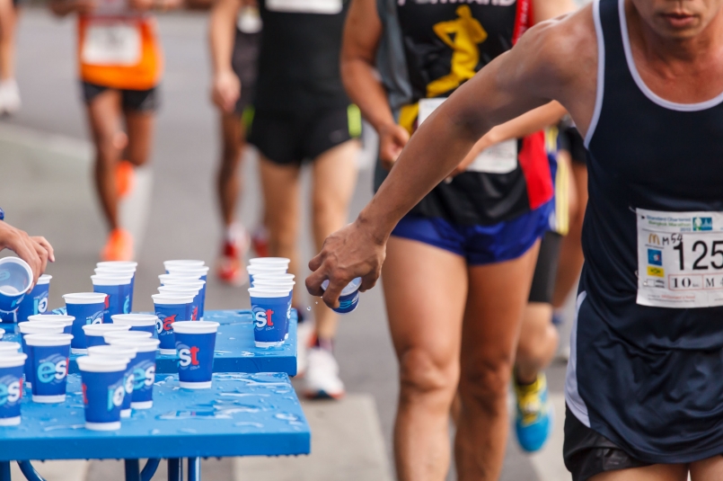根據國際馬拉松醫學指導協會(IMMDA)建議,馬拉松跑者在比賽間,每小時應喝下 400~800cc 液體,氣溫越高且速度越快的跑者,液體補充需越多。