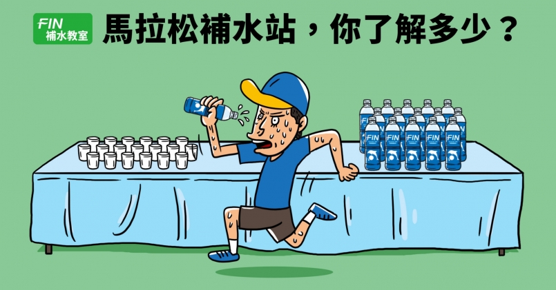 水分補給時機,不是等到口渴了才喝, 越早開始補水,會讓腸胃道越快速吸收水、電解質與糖分,並保持身體充足的水分。陳彥良說明,全馬每 30 分鐘應補 100 卡熱量、每 20 分鐘即可補給 150-250 cc 水分,完賽時間拉的越長,次數自然也越多。舉一個 7 分速跑友來說,最佳的補給方式可在起跑前 5 分鐘,喝約 200cc 水分,起跑後則每 15-20 分鐘可以補 100-200cc 的水;超過一小時可每 10-20分 鐘補充 100-200cc 的運動飲料。以 FIN 運動飲料為例,其電解質與糖含量較適中,且等滲透壓與人體細胞較接近,能更快讓人體吸收,並提供能量及補充流失的電解質、避免抽筋。