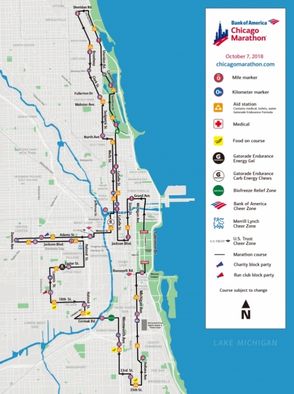 超級平坦、寬闊的賽道,風光獨特的環形跑道,稱得上是世界上著名的「馬拉松快道」,賽事起點和終點都在密歇根湖畔開闊的格蘭特公園,這條路線充分展示了芝加哥城市景觀特色,從市中心的摩天大廈到不同種族的聚居區,參賽者將穿越29個不同族裔的社區,途徑包括芝加哥的唐人街等十餘處城市歷史地標建築,沿途會受到一百七十萬不同族裔熱情觀眾的熱烈歡迎,喝彩助威。
