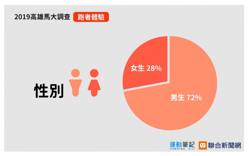 完整填答跑者的男女比例為72% : 28%,年齡層以36~45歲佔46%為最多,其次是26~35歲的23%及46~55歲的22%,常住在高雄者(48%)與非常住高雄者(52%)的比例幾乎各佔一半。調查結果使用SPSS統計軟體作為分析工具,經由次數分配,以及敘述性統計分析等方式,針對各題項進行統計分析。