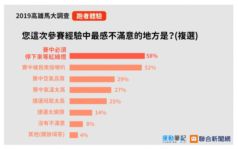 然而,令跑者最不滿意的,就是歷年來高雄馬參賽者多所抱怨的等紅綠燈問題,在可以複選的情況下,「賽中必須停下來等紅綠燈」高居最不滿意第一位,其次是「賽中被民眾按喇叭」。