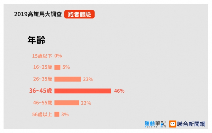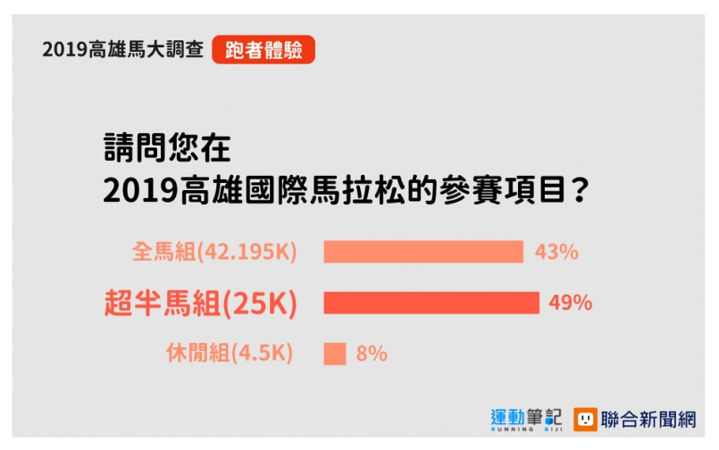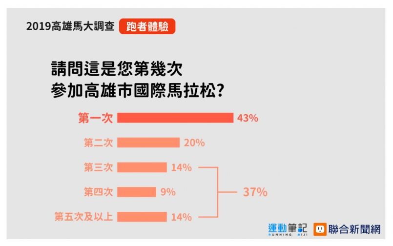 這次參與問卷調查的跑者有43%參加的是全馬組、49%參加25K超半馬組、另有8%參加4.5K的休閒組;其中第一次參加高雄馬的跑者佔43%、第二次20%、第三次14%、第四次9%、第五次(含)及更多次的佔14%,合計跑過三次(含)以上的高雄馬「識途老馬」佔了37%。