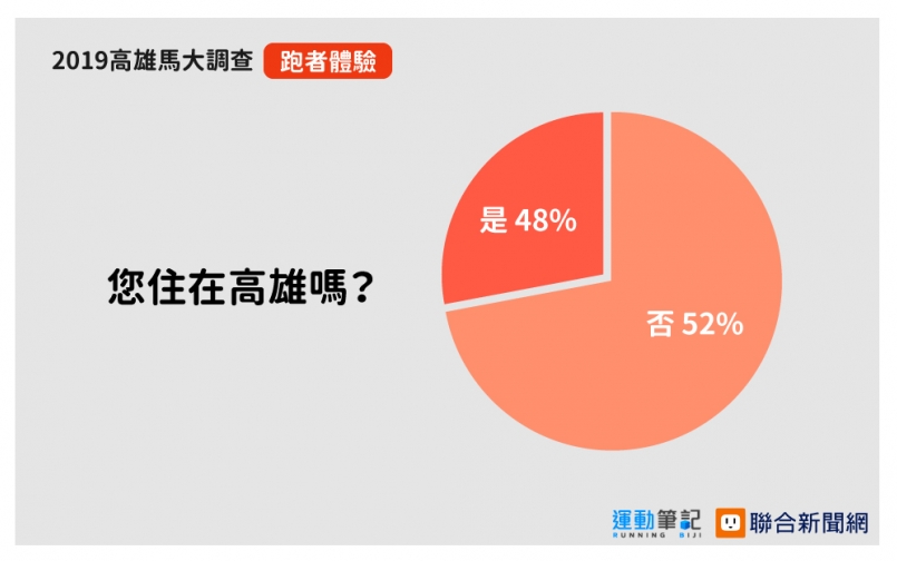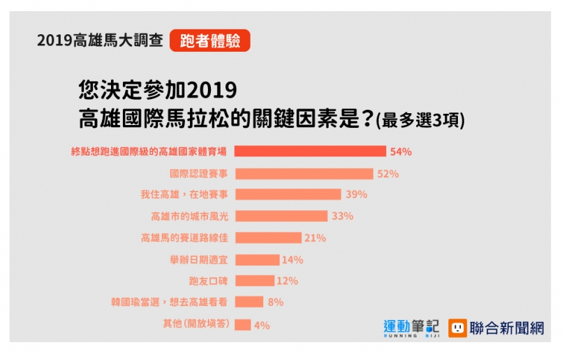 決定參加高雄馬的關鍵因素,在問卷設計「最多選三項」的情況下,前三大原因依序為:「終點想跑進國際級的高雄國家體育場」(54%)、「國際認證賽事」(52%)、及「我住高雄,是在地的賽事」(39%);比較有趣的是,因為「韓國瑜當選,想去高雄看看」的佔了8%。