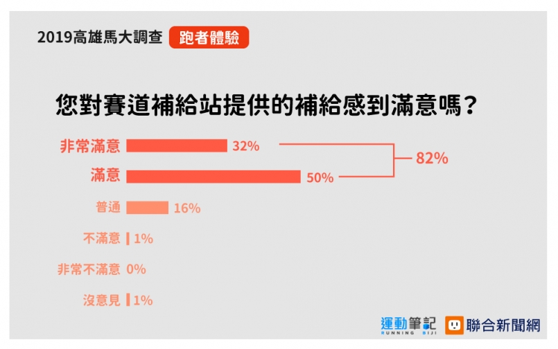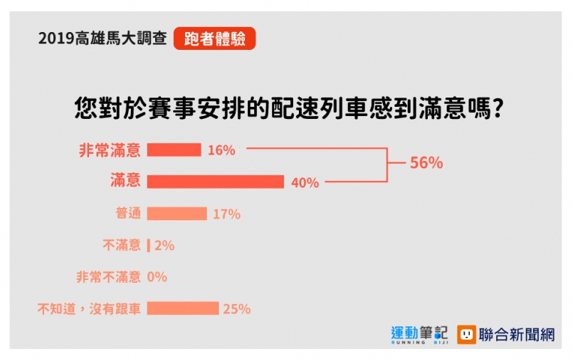 這次賽事的官方補給和私補澎湃、啦啦隊夾道熱情加油,跑者都感受到了,尤其「沿途加油民眾的熱情」有90%表示滿意。至於配速列車的表現,除了25%跑者未跟車,滿意度也超過五成(56%)。綜合所有的滿意度指標平均之後,總體而言今年8成的跑者都對高雄馬感到滿意。