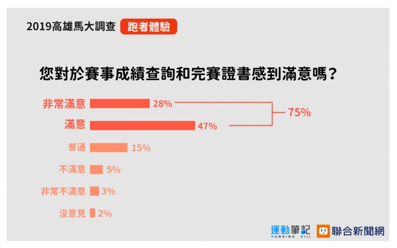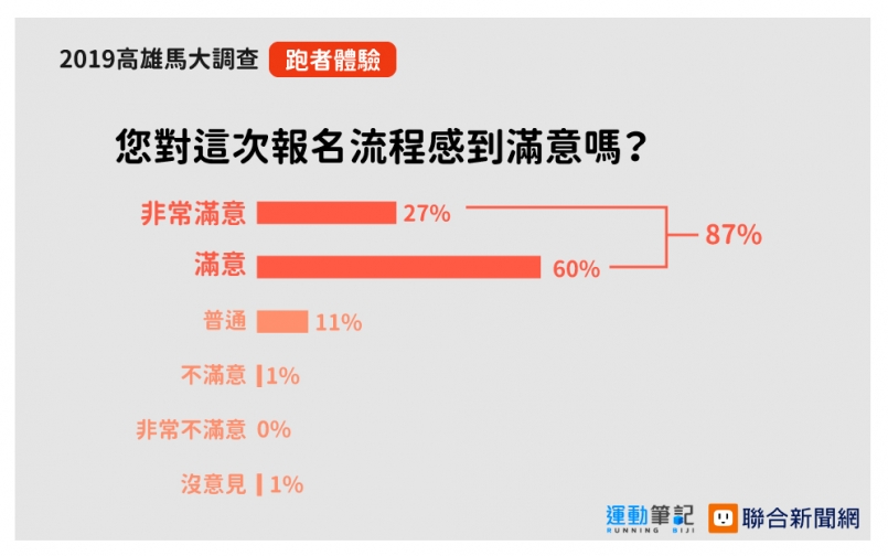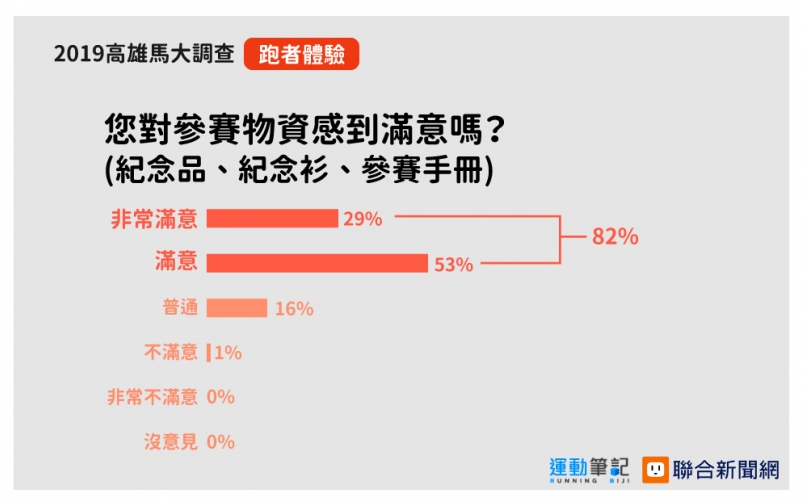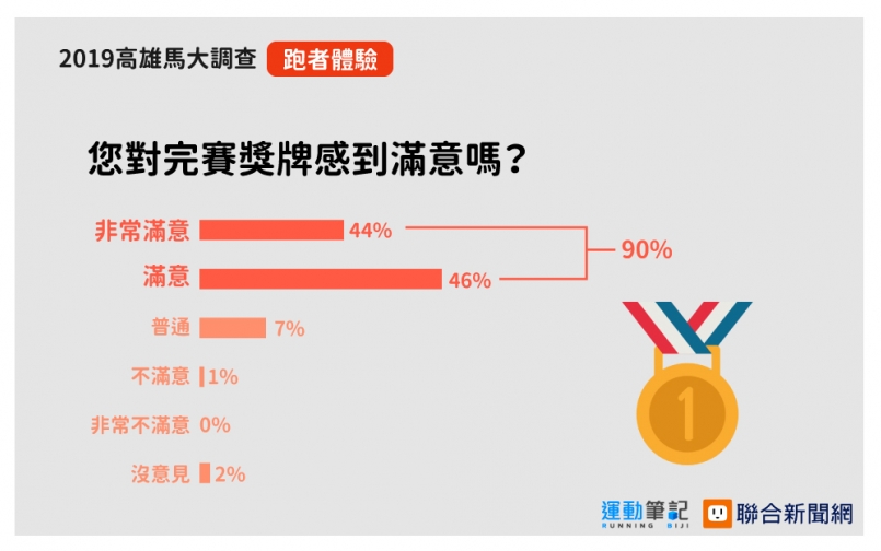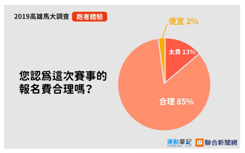 高達85%跑者認為這次報名費合理,87%對於報名流程感到滿意,82%對紀念品、紀念衫和參賽手冊等參賽物資感到滿意;而對於完賽獎牌感到滿意的也高達90%。