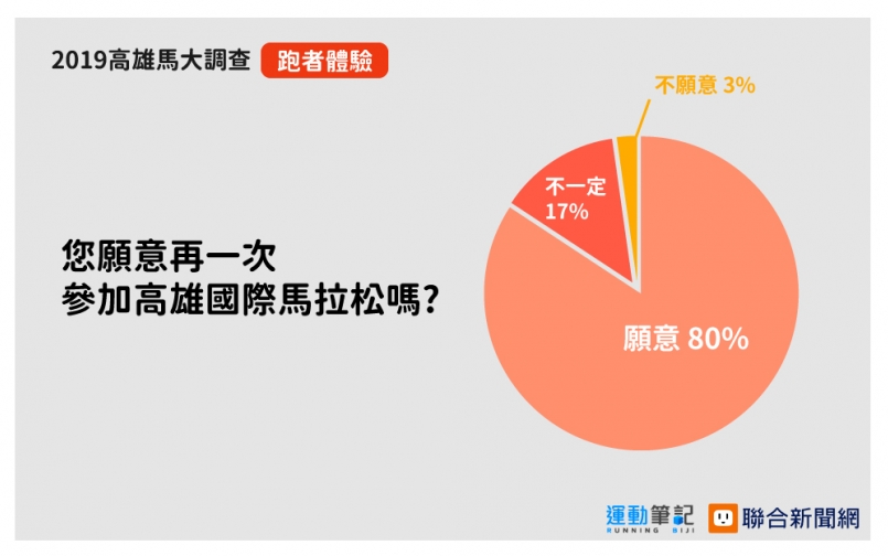 也有許多跑者填寫「起跑分區不確實」、「寄物動線亂」等問題;即便如此,仍有高達80%跑者表示願意再參加一次高雄馬,不願意的僅有3%,值得主辦單位珍惜跑者心聲和對高雄馬的期待,讓下一次賽事辦理得更臻完善!