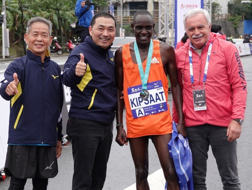 侯友宜(左二起)、第一名選手 Mathew Kipsaat、萬金石馬拉松國際田徑總會觀察員馬格納尼。(圖片來源:記者毛琬婷/攝影)