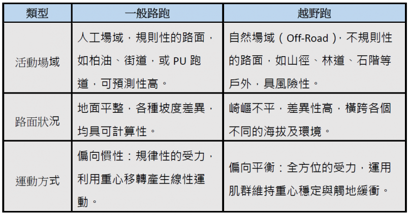 一般路跑 vs. 越野跑(表格來源:Mong Kwung Wong自行整理)