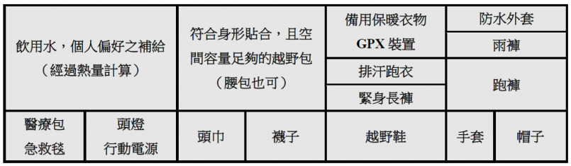 由上延伸,越野跑所有可能會需要使用到的裝備,筆者以下圖及表扼要說明: