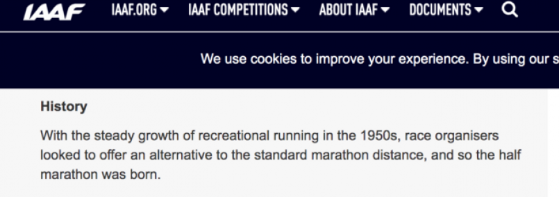 「隨著 1950 年休閒跑步的逐漸興起(穩步增長),賽事組織者提供了一種標準馬拉松的替代賽事,半馬應運而生」(截圖來源:IAAF)