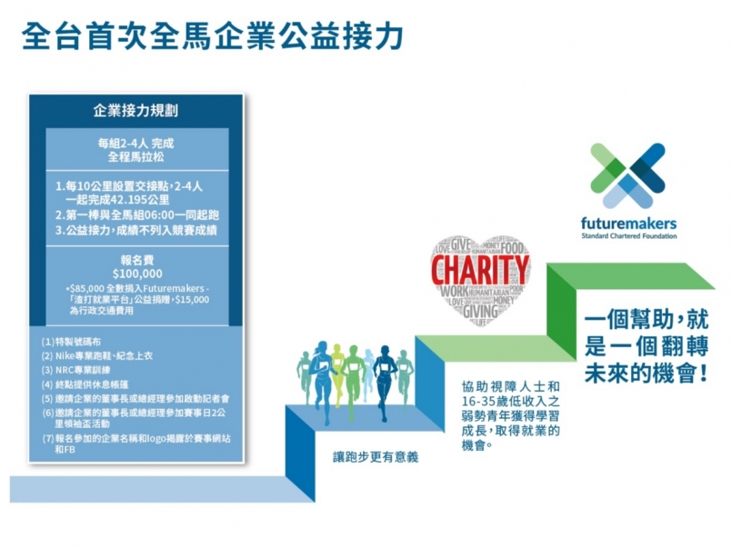 - 每組企業公益接力報名費扣除 TWD 15,000 行政費用(含交通、裁判、賽衣、晶片等費用),餘款 TWD 85,000 將全數捐給 Futuremakers -「渣打就業平台」,透過社福團體,幫助視障者多元就業和弱勢族群完成其職業夢想。