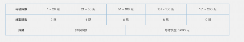 - 揪團組成績計算方式為 : 8 名團員共同成績加總計算成績排名,如完賽人數未達 8 名,不列入揪團組成績排名。錄取組數將按實際報名組數決定(請參考下列表格)。![]() *團體成員不得重複領取個人獎勵。 *團體成員不得重複領取個人獎勵。