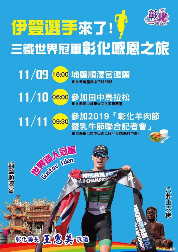 挪威三鐵選手伊登讓彰化「埔鹽順澤宮」的宮廟帽成為揚名國際的冠軍帽,在彰化縣政府熱情邀請下,縣府今天公布艾登本周抵台的 3 天行程,他預計 11 月 9 日抵達台灣就直奔埔鹽鄉順澤宮還願,接下來參加田中馬拉松領跑外,也將與縣長王惠美一起展開料理秀,行銷彰化優質農特產品。