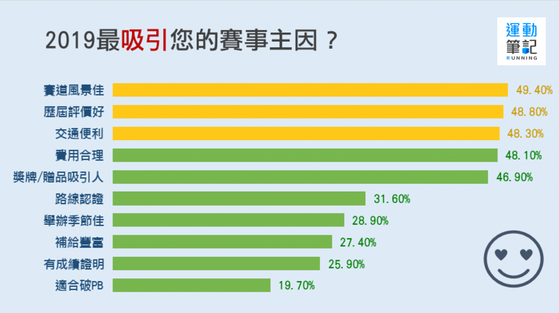 此外,從「路線認證」、「適合破PB」兩項進入前十大主因,也可以知道,有許多跑者對於精進自我,也有很多期許,希望能透過一次又一次的比賽,檢核自己的表現。
