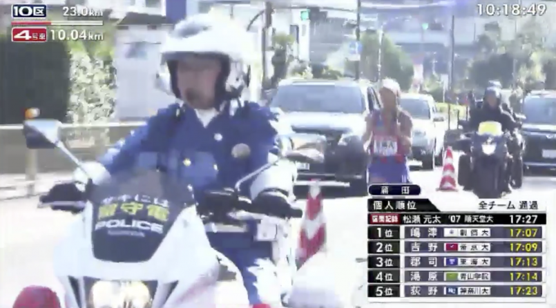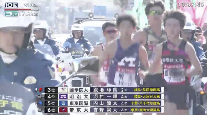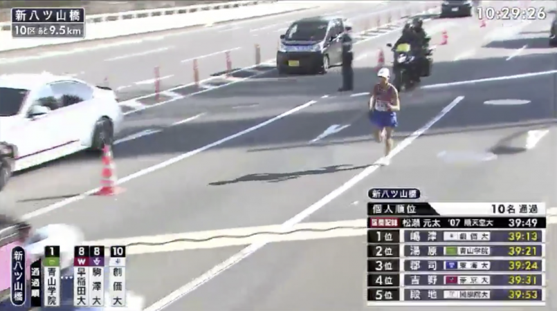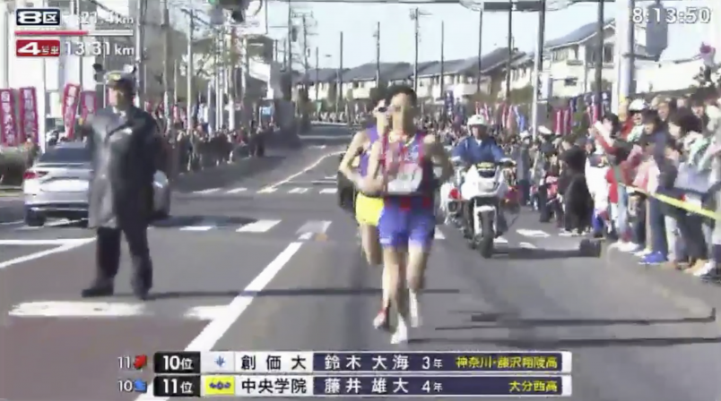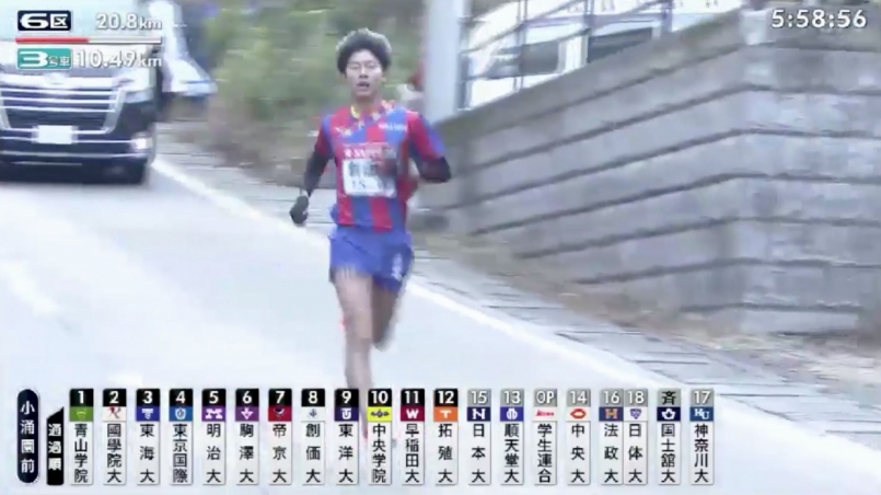第十區的選手起步很快,五位選手在6k左右都快於區間紀錄配速,創價大嶋津雄大暫居區間最速,追擊種子權縮小到18秒差距。