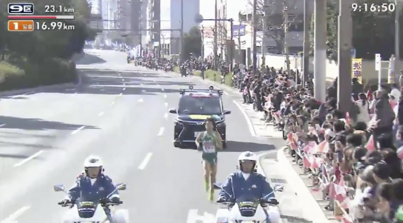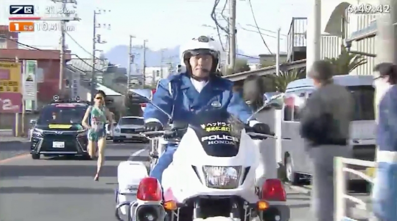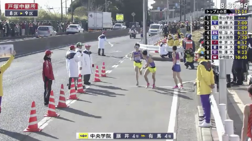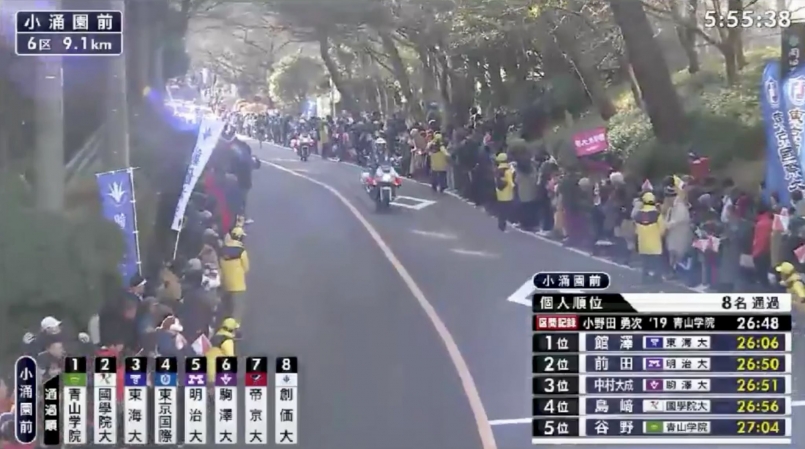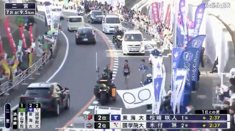 九區選手陸續通過權太坂,領先的青學大的神林、東海大的松尾以區間紀錄的配速持續拉開與後方差距。