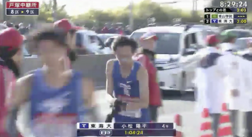 東海大松崎咲人加速甩開國學院大的木付,和青學大差距縮小到2:00。