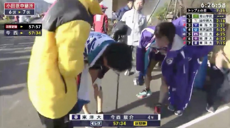 六區區間排行:1東海大 館澤亨次 57:17 區間新 2東洋大 今西駿介 57:34 3青學大 谷野航平 58:18