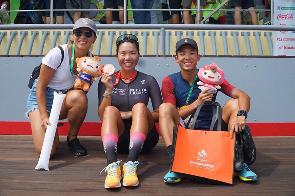 2019 年全國運動會,張婷婷(中)連霸個人公路計時賽后座,姐弟們一同開心慶祝。(圖片來源:張家班鐵人隊)