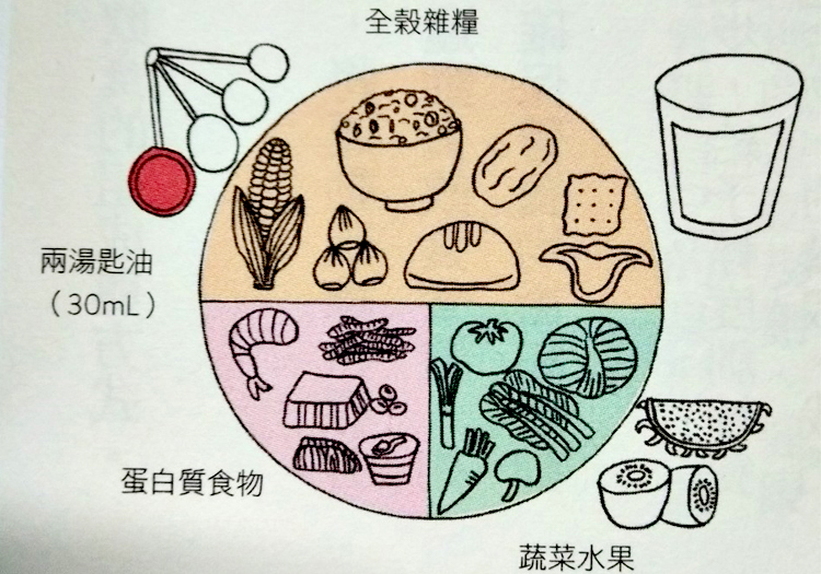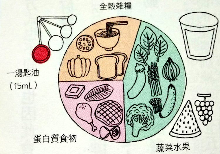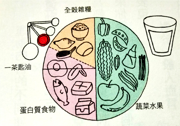 每餐的飲食量,蔬菜水果佔1/2。全穀雜糧(米飯、地瓜、紅豆、綠豆、玉米等)佔1/4,如果要控制體重則吃1/6。剩下的部分則是瘦肉蛋白質食物(豬肉、魚肉、牛肉、雞肉、黃豆製品、雞肉、乳製品)。