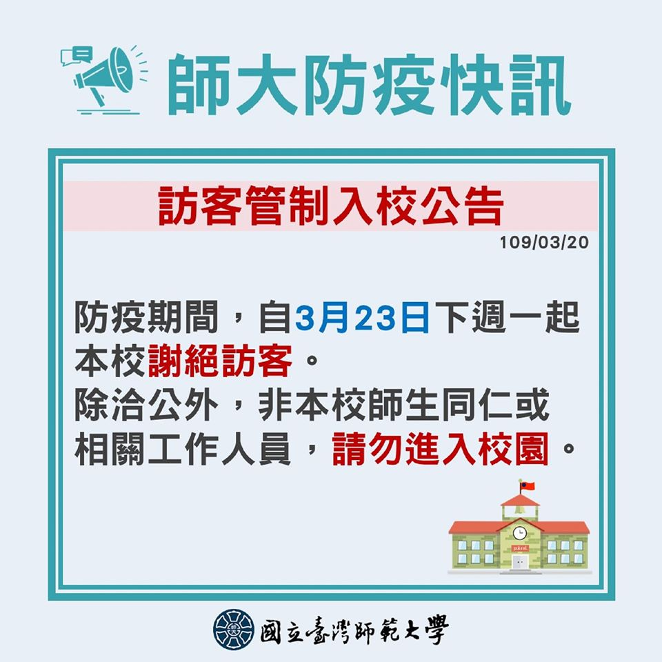 防疫期間,自3月23日下周一起,本校謝絕訪客。除洽公外,非本校師生或相關工作人員,請勿進入校園。