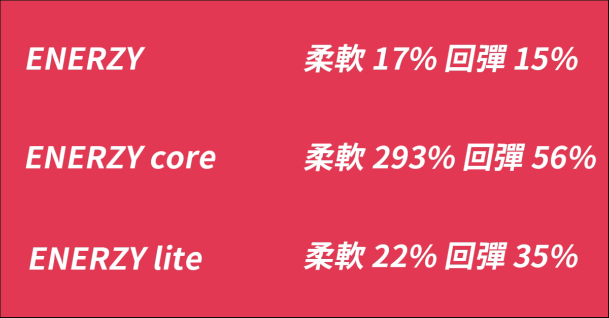 MIZUNO ENERZY 配合不同使用場景,由優越柔軟性及回彈性的「MIZUNO ENERZY core」、追求輕量性的「MIZUNO ENERZY lite 」、及標準「MIZUNO ENERZY 」三種性質組合。