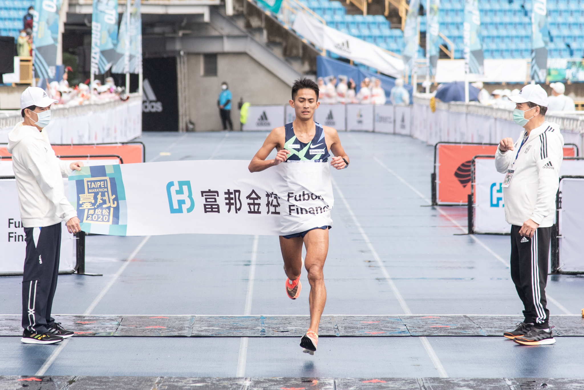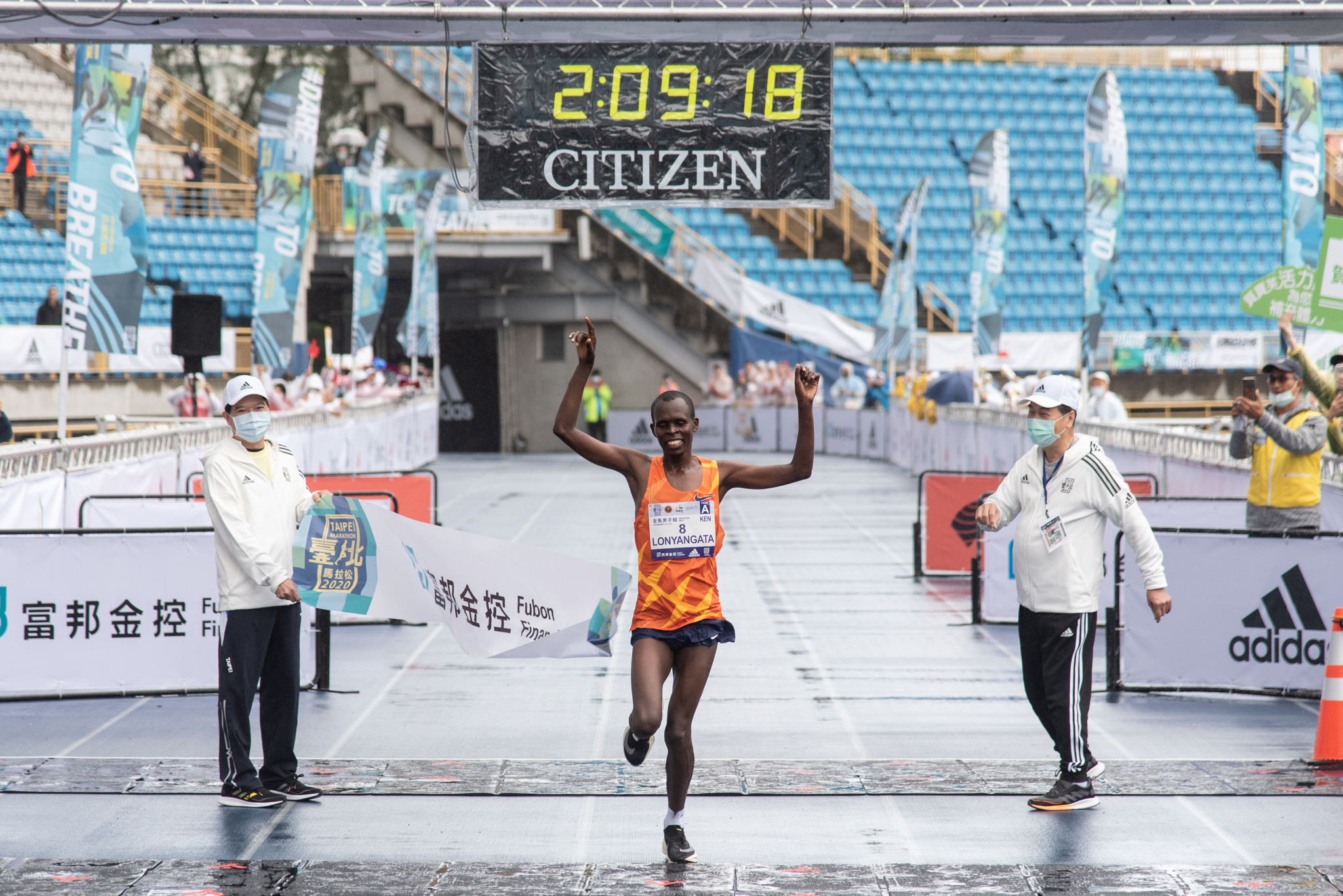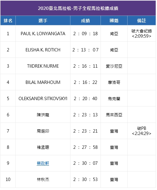 2020 臺北馬拉松在綿綿細雨中鳴槍開賽,總計達 28,000 名跑者共襄盛,熱情活潑氣氛絲毫不受低溫寒冷天氣影響。令人興奮的是,來自肯亞的 LONYANGATA 以 2 時 09 分 18 秒率先衝線並改寫大會紀錄,原先場地記錄是 2016 年由 KITWARA 創下的 2 時 09 分 59 秒;第二名由同國好手 ROTICH 以 2 時 13 分 07 秒奪下,第三名則是愛沙尼亞選手 NURME 以 2 時 16 分 11 秒緊跟在後;由於國際疫情嚴峻,國際選手必須提前抵台接受隔離檢驗,在訓練狀態與運動表現多少受到影響下依舊展現非凡實力。