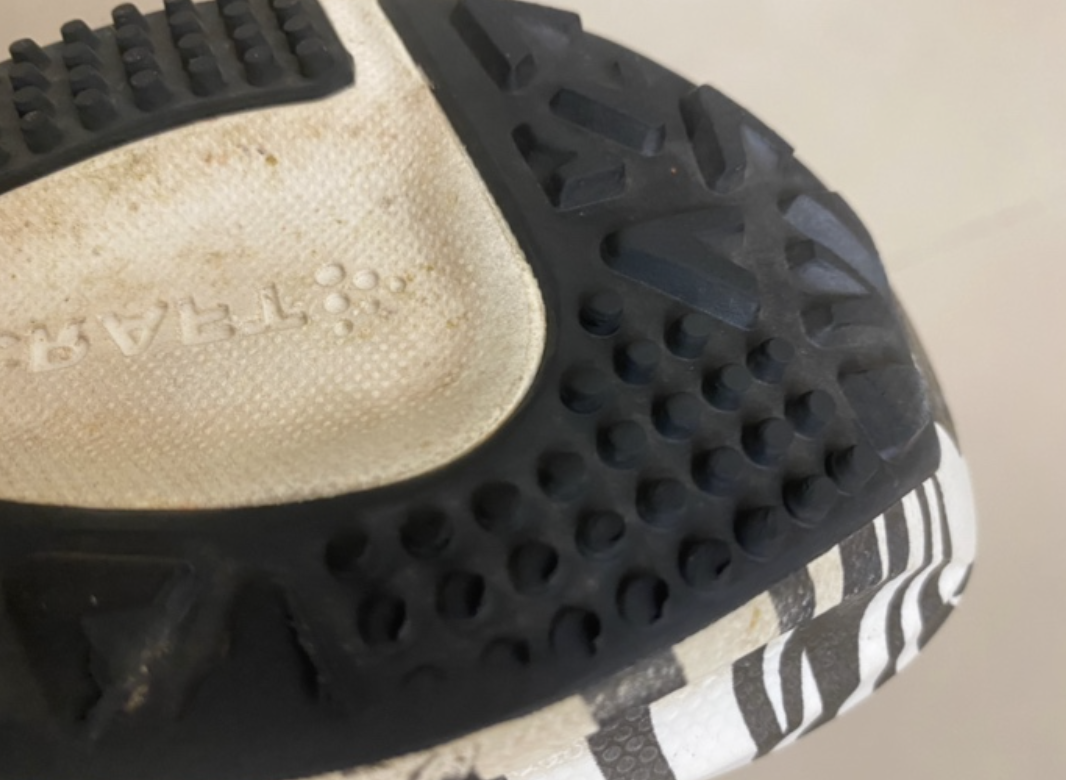 唯一磨損較明顯的是腳後跟外側,其中因為突起的小顆粒幾何結構較易磨損,但是還約有1mm的外底橡膠可以使用。