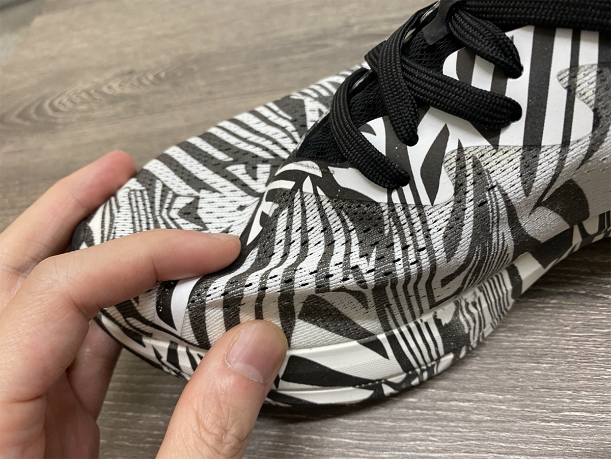 由官方以及筆者拍的的圖片,我們可以知道鞋子主要鞋面由單層彈性網布構成,中底是 Vault Foam(EVA泡綿)中間夾了碳板組成,外底橡膠刻紋很深,大概 3mm 厚。