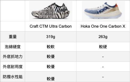 目前以筆者穿過的跑鞋和 Craft CTM Ultra Carbon 比較,最為相近的是 Hoka One One Carbon X。筆者認為,這兩雙跑鞋是最好的馬拉松訓練鞋以及超馬競賽用鞋。這兩雙都有良好的滾動感增加跑步經濟性,也有足夠的中底緩衝,碳板的推力輔助,良好的鞋面透氣性,可以幫助跑者應付馬拉松的訓練,以及超越馬拉松長度的比賽。筆者將其中些微的感受差異一一列下: