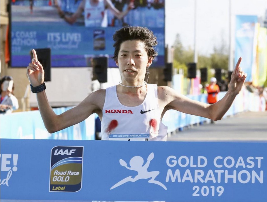 這是 2019 年,日本名將 設樂悠太 在黃金海岸馬拉松以 2:07:50 成績勇奪男子冠軍的衝線照,然而最讓人在意的是衣服上的血跡!