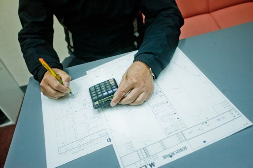 看到這裡你或許有些印象,國內也有跑鞋廠商推出相關的電腦足測,經由3D掃描後繪製出腳的型態並提供選鞋建議,M.Lab如果也做一樣的事,那就不叫M.Lab了,訂鞋量測的最後一個、也是最重要的一個步驟。三村先生要我踩在一張測量紙上,拿著筆,繪出我的腳型,拿著尺,將我腳板的各個部位、與小腿肚至腳底板的間距量出,它將所有立體的數據匯整為間單的數字。接著用計算機算出各種公式,這是他的獨門工夫,近半世紀的經驗累積,所以沒有公開。