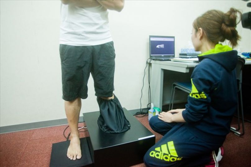 首先,我趴著、躺著、站著,讓工作人員仔細地量測腳的數據,接著進行3D立體足測,先用筆標記腳掌的骨骼位置,接著套進暗袋,利用雷射掃描定位,電腦馬上會將你的3D立體腳型繪出。
