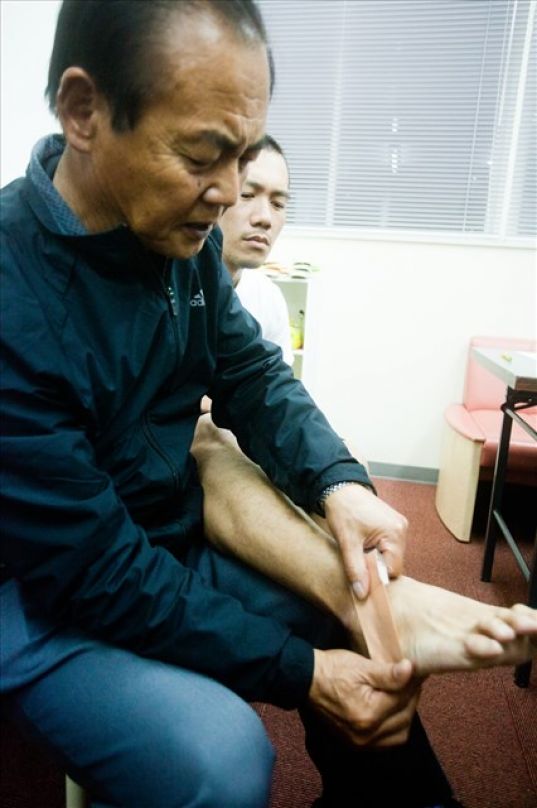 我在跑步的時候,重心落在腳掌外側,也就是所謂的內旋不足(Underpronation),於是他立即幫我貼紮,從腳掌外側到腳內側上方順貼,試著讓腳掌重心調整到正確的位置,平衡腳掌落地時的壓力。