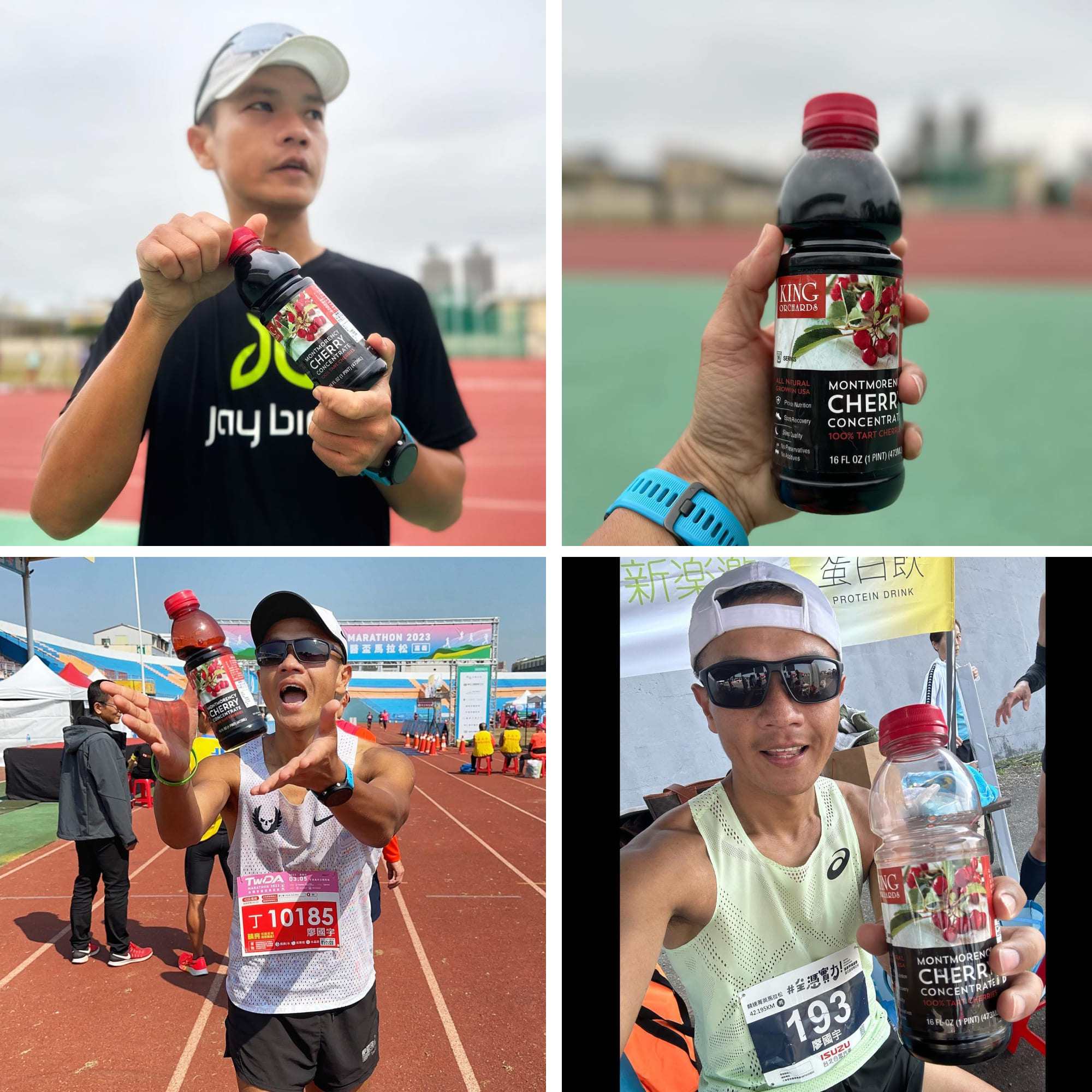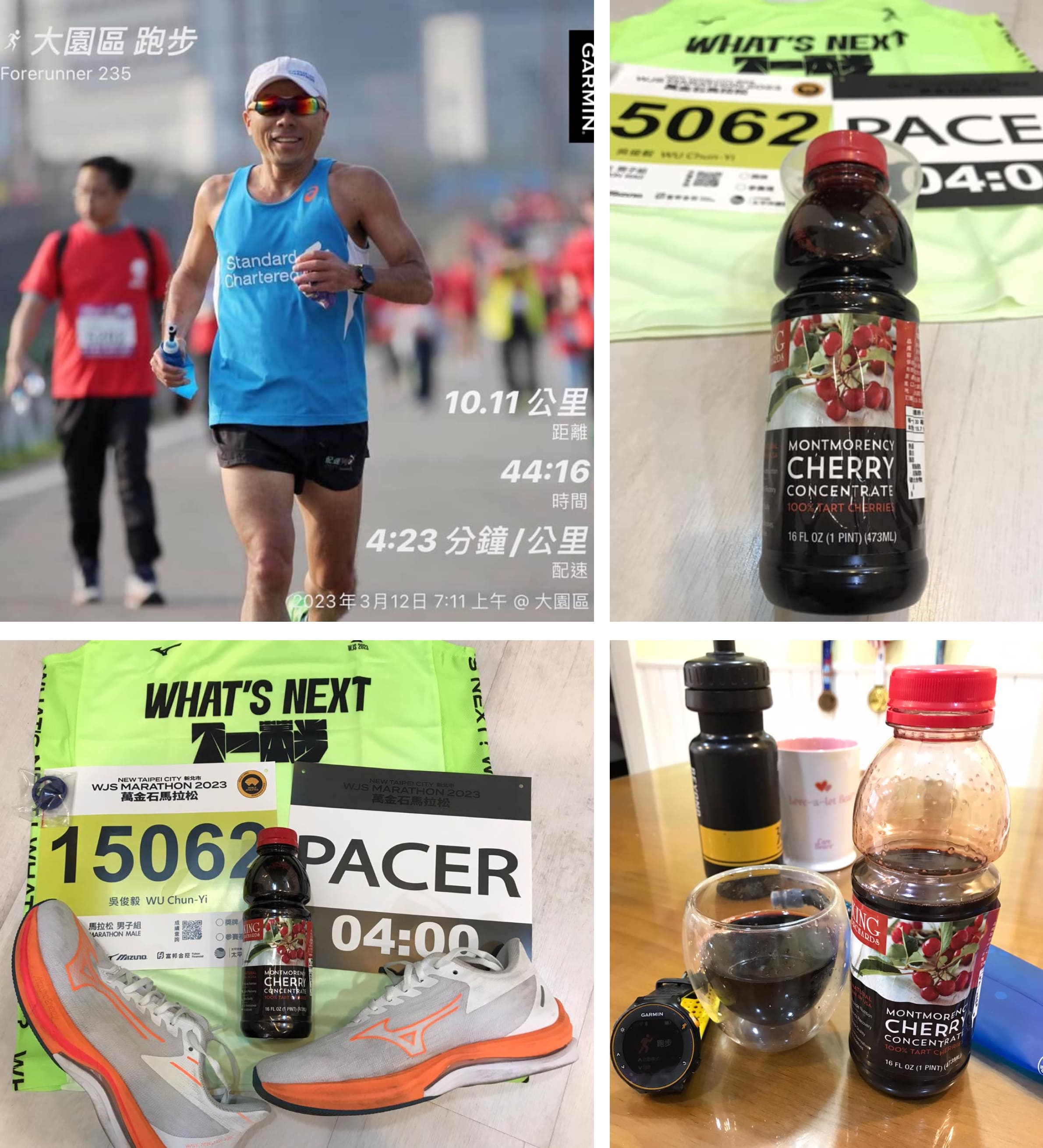 顯金:「近期幾乎週週馬拉松,疲勞一直都在累積,身體組織也處在恢復狀態,自己除了調整課表,充分休息、補充營養均衡之外,還使用了櫻桃王100%酸櫻桃汁作為訓練後修復及賽後的補給,運動後來一杯幫助迅速恢復。」