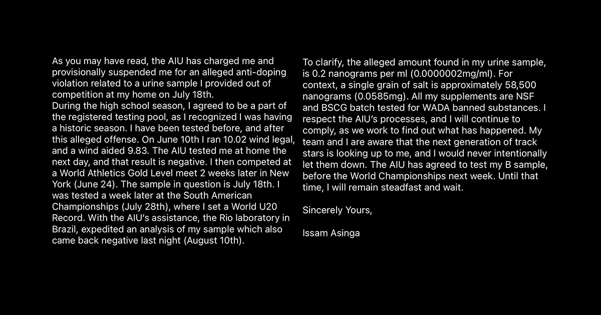 對此,Issam Asinga 也在社群平台上發文澄清,內容大致上是講述被臨時禁賽的原因是與 7/18 日在家裡提供的賽外尿液樣本有異,不過 Asinga 提到自己在這個日期之前與之後的尿液樣本接呈現陰性,包括寫下 U20 世界紀錄時的尿液檢測;並且,他還說該樣本中發現的含量其實僅只有 0.2 毫微克,一粒鹽的含量則約 58,500 毫微克,他尊重 AIU 的流程。
