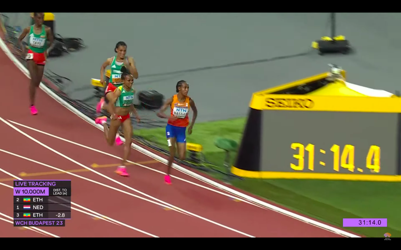 整場一直在隊伍後段的 Hassan 憑借優異的爆發開出,來到領先位置。圖/World Athletics直播截圖
