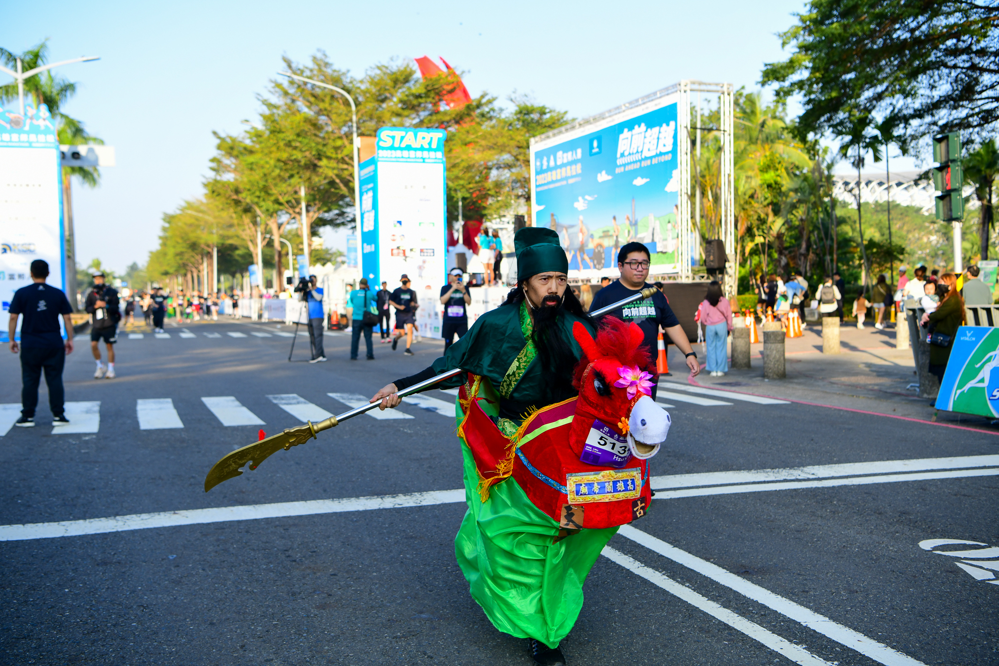 休閒組賽道會沿著世運大道繞行一圈返回世運主場館內,讓參與者在輕鬆的氛圍中享受運動樂趣,為了增添活動樂趣,比賽還特別增設創意造型獎,讓變裝跑者在比賽中展現各種創意,從「江南四大才子」、「關雲長」變裝種類應有盡有,成為賽道上的一大亮點,每當變裝跑者經過更是讓賽道充滿驚喜與歡呼。 跑者變裝為「關二哥」騎著赤兔馬在賽道上疾馳。圖/運動筆記 @詹偉業