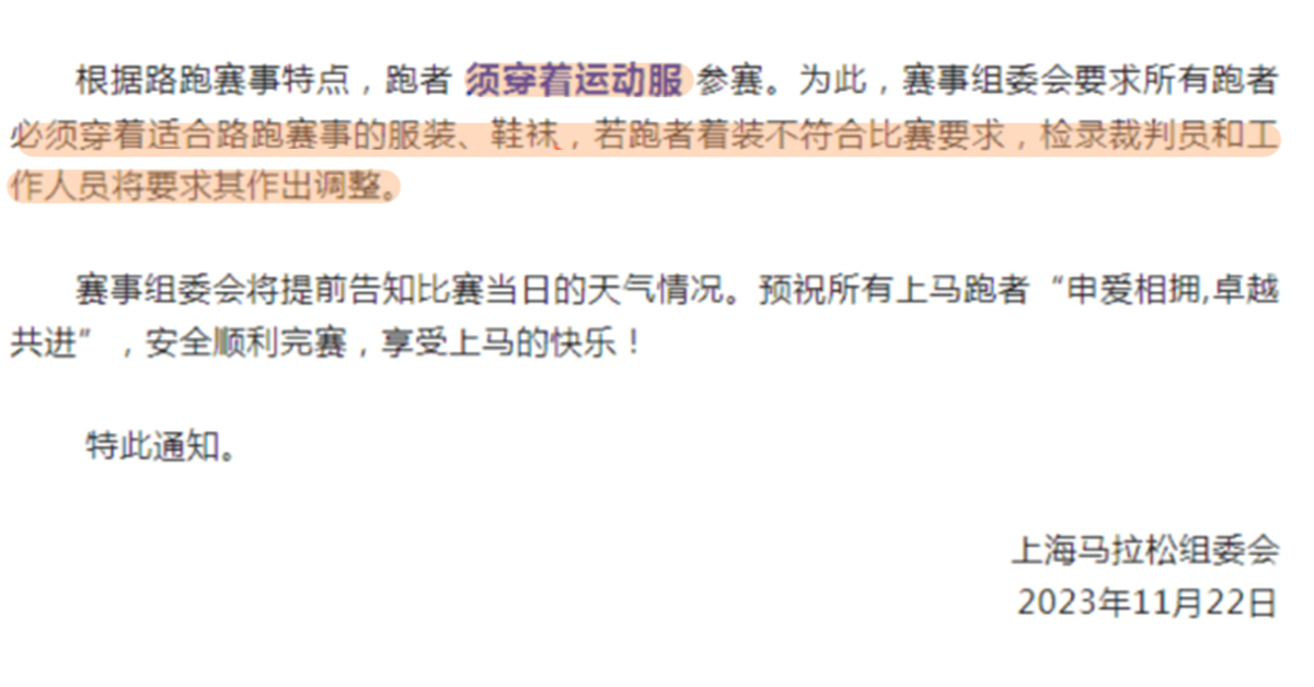 在比賽舉行的前幾日,主辦單位特地重申一項比賽規定,內容寫著:「所有的跑者必須穿著適合路跑賽事的服裝及鞋襪,若跑者不符合比賽服裝要求,檢錄裁判及工作人員可以要求跑者做出調整。」這意味著若是參賽者不符合大會人員的要求,當局有權令他更換服飾,甚至嚴重可以要求該民眾退出比賽。