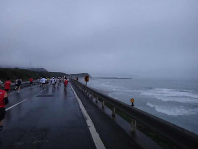 最後的3K,有海浪,有隧道,相機剛好失靈 (設定跑掉了),發現200的步頻跑的不順 (跟不上腳步),退回到195後將腳步跨大反而效果好一點,但眼看著智雄老弟一直離我遠去,估計,最後2K他應該用了4分速的力量在跑~ (恭喜他以315完賽)