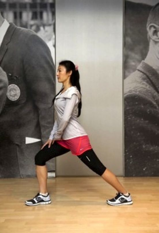 - 小腿後肌與阿基里斯腱:弓箭步姿勢,雙腳腳尖朝前,後腿打直、後腳跟完全著地,慢慢將前大腿往前下方壓,直到後小腿有伸展的感覺為止。維持20秒後,再換另一腳。