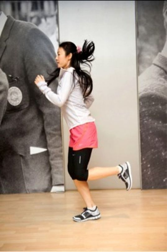 2. 擺臂:以腰際為中點,往前手肘擺到腰際,往後則拳頭回到腰際。試著把擺臂的節奏和雙腿搭配起來,協調的上下半身,是跑步流暢的關鍵。