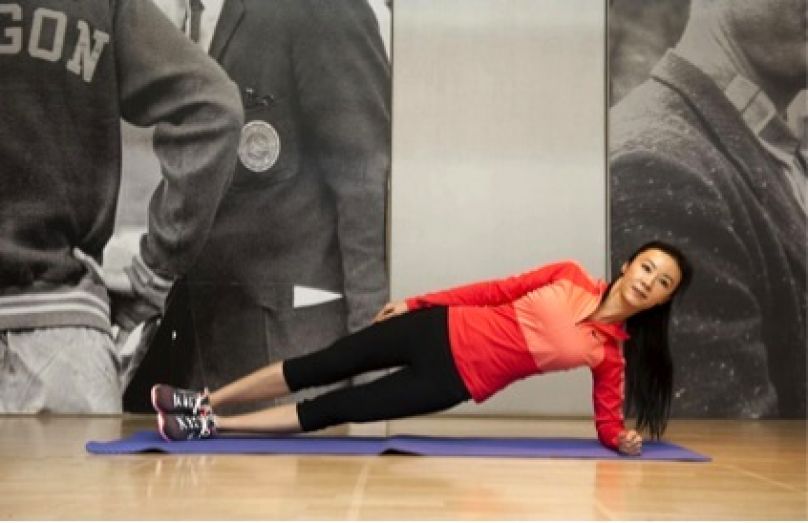2. 側面撐體:側躺以手肘撐起身體,手臂與地面垂直,縮緊臀部,頭、肩、臀、腳呈一直線,維持30~60秒。從頭、肩、腹、臀、腳均需呈直線,收腹、夾臀,並注意身體是否前倒或後翻。