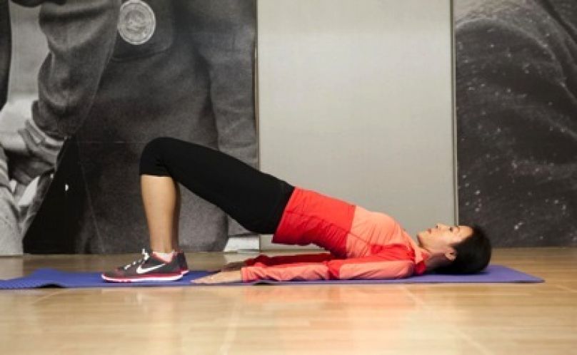 3. 橋式:膝蓋彎屈、腳踩地平躺,兩手放於體側,從骨盆處慢慢將臀、背部提起離地,此時膝蓋彎曲接近90度,胸、臀、膝呈一直線,維持30~60秒後放鬆下放。