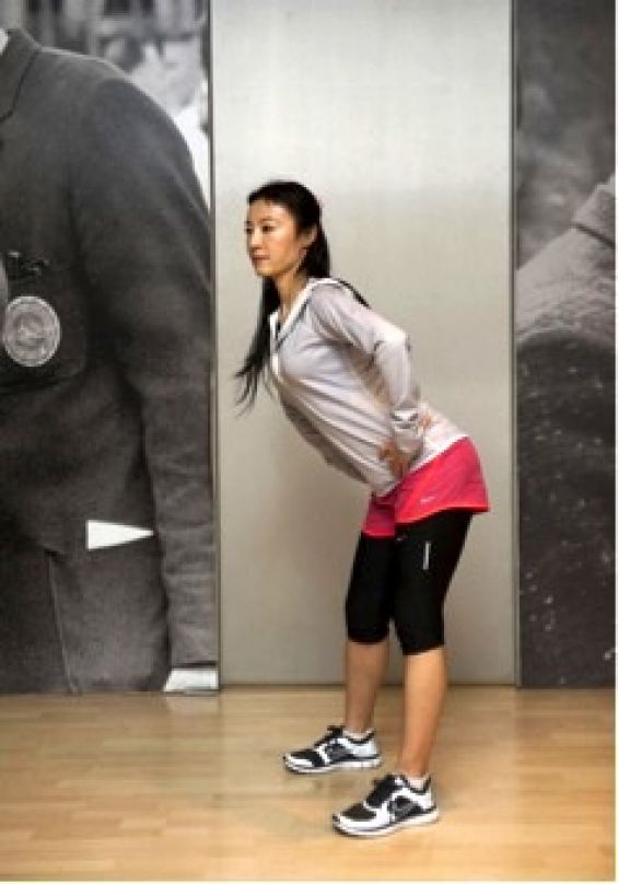 - 大腿後肌:伸出一腳,打直並以腳跟著地,手叉腰、臀部往後縮,不要彎腰,上半身微微地往大腿靠近。維持20秒後,再換另一腳。