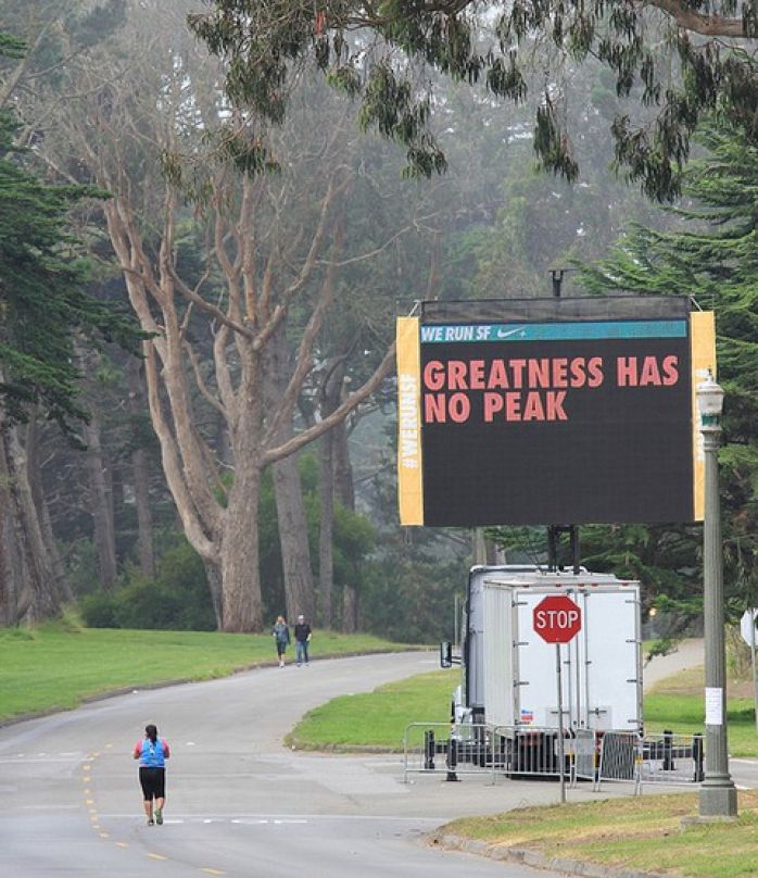 在滿是上坡下坡的舊金山馬拉松路線,這樣的提醒標語,告訴你前方毫無坡度,顯得特別貼心。