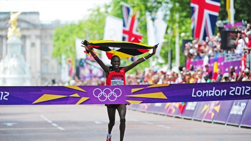 烏干達選手Kiprotich開心舉旗衝線 (圖片來源:奧運官網)