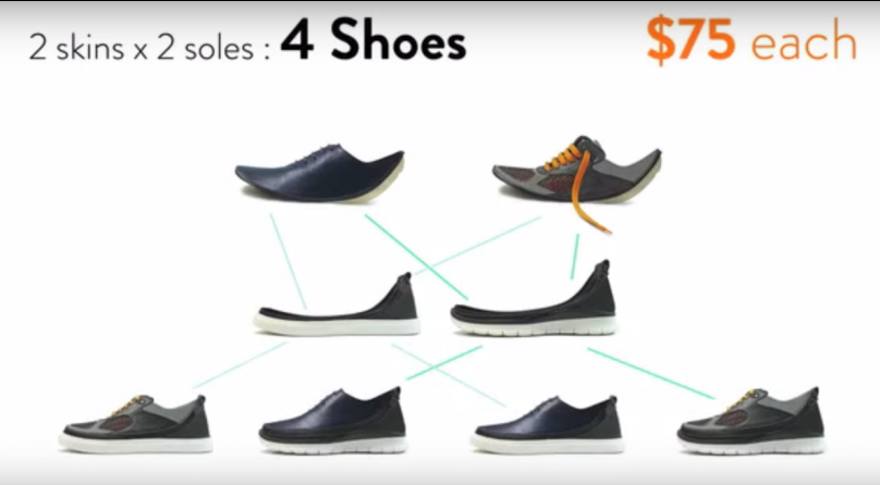 只要買一雙鞋,剩下就只需要買鞋皮(鞋子的半價),就能夠呈現不同的風格,有如一雙新的鞋子,影片中舉例兩雙鞋兩個鞋皮,就能呈現四種不同的鞋子,前前後後將會省下不少的預算。