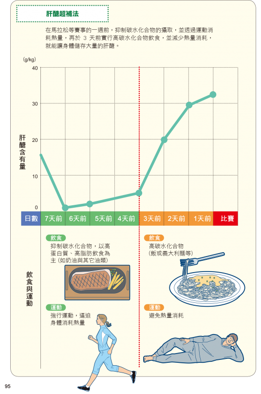 在馬拉松等賽事的一週前,抑制碳水化合物的攝取,並透過運動消耗熱量,再於3天前實行高碳水化合物飲食,並減少熱量消耗,就能讓身體儲存大量的肝醣。